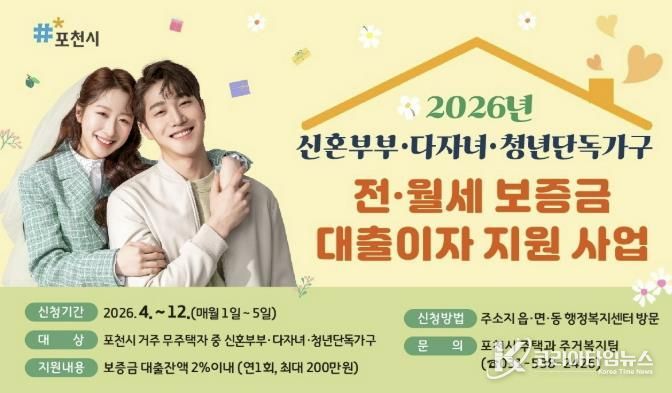 코리아타임뉴스 윤광희 기자 | 포천시는 ‘2026년 신혼부부·다자녀·청년가구 전월세 보증금 대출이자 지원사업’을 추진한다.