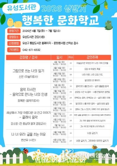 코리아타임뉴스 대전취재본부 | 대전 유성구는 4월부터 7월까지 주민의 문화 향유 기회를 확대하고 정서적 치유를 지원하기 위한 ‘2026년 상반기 행복한 문화학교’를 운영한다.
