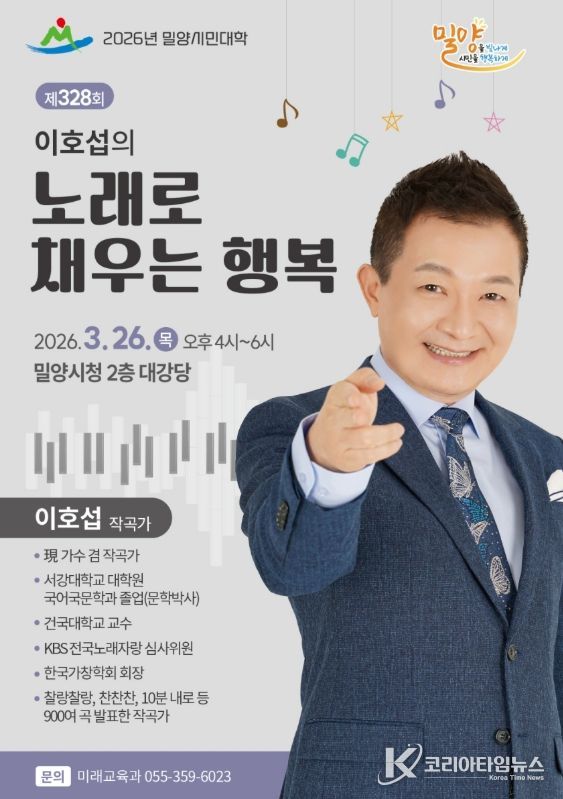 코리아타임뉴스 오영주 기자 | 경남 밀양시는 오는 3월 26일 오후 4시 시청 대강당에서 제328회 밀양시민대학 강연을 개최한다. 이번 강연은 대한민국 대표 작곡가이자 방송인인 이호섭 씨를 초청해 ‘노래로 채우는 행복’이라는 주제로 진행된다.