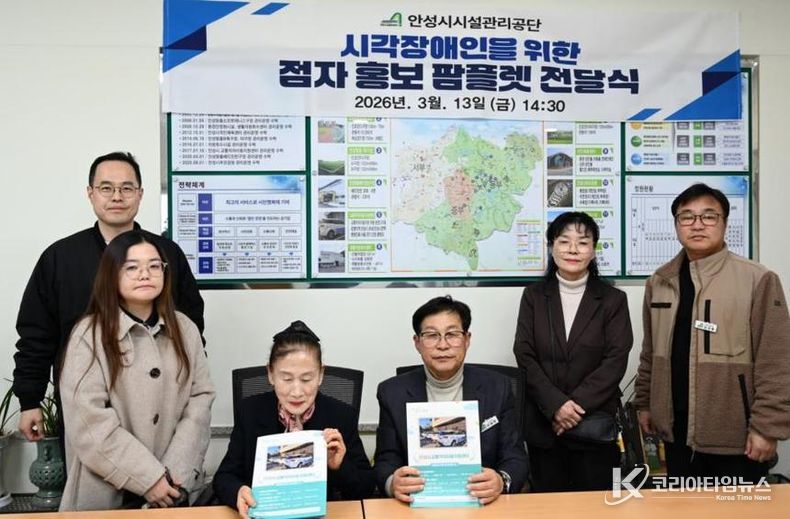코리아타임뉴스 경기취재본부 | 안성시시설관리공단은 지난 13일 안성시 시각장애인협회에 시각장애인의 교통정보 접근성 향상을 위한 점자 홍보물(팜플렛)을 전달했다.