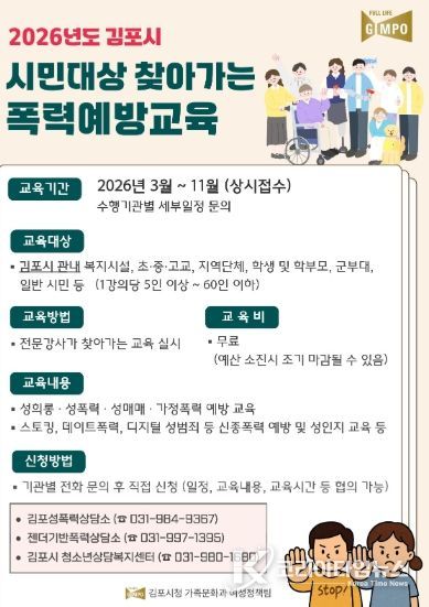 코리아타임뉴스 기동취재팀 | 김포시는 시민의 건전한 성 가치관 형성과 폭력 예방 의식 확산을 위해 ‘2026년 김포시 시민대상 폭력예방교육’ 사업을 3월부터 11월까지 추진한다고 밝혔다.