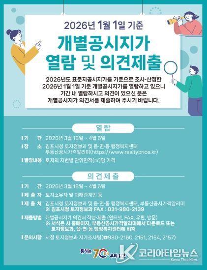 코리아타임뉴스 기동취재팀 | 김포시는 2026년 1월 1일 기준 개별공시지가(안)에 대하여 오는 3월 18일부터 4월 6일까지 열람을 실시하고 토지소유자 및 이해관계인의 의견을 접수한다고 밝혔다.