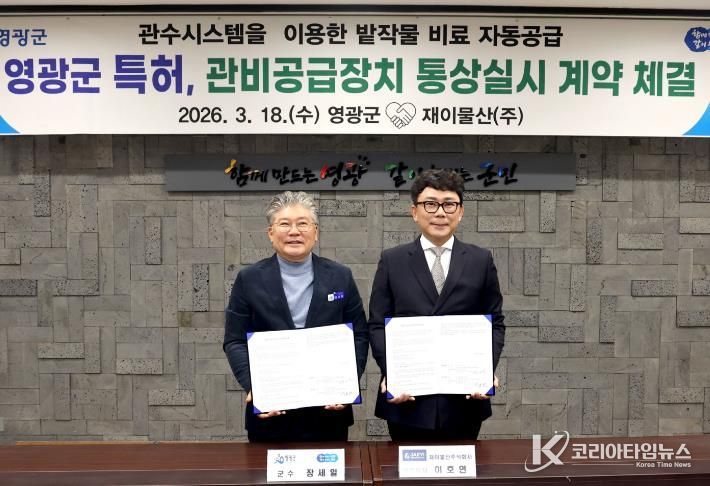 코리아타임뉴스 노승선 기자 | 영광군은 지난 18일 전북 군산시에 위치한 재이물산(주)과 ‘관비공급장치’ 특허에 대한 통상실시권 계약을 체결했다고 밝혔다.
