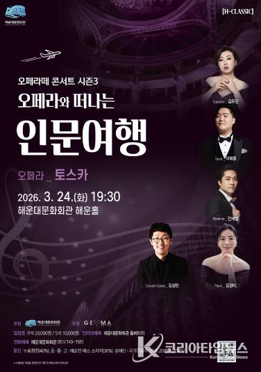 코리아타임뉴스 김태훈 기자 | 해운대문화회관은 24일 오후 7시 30분 오페라떼 시즌3 ‘오페라와 떠나는 인문 여행’ 첫 무대로 오페라 ‘토스카’를 해운홀에서 개최한다.