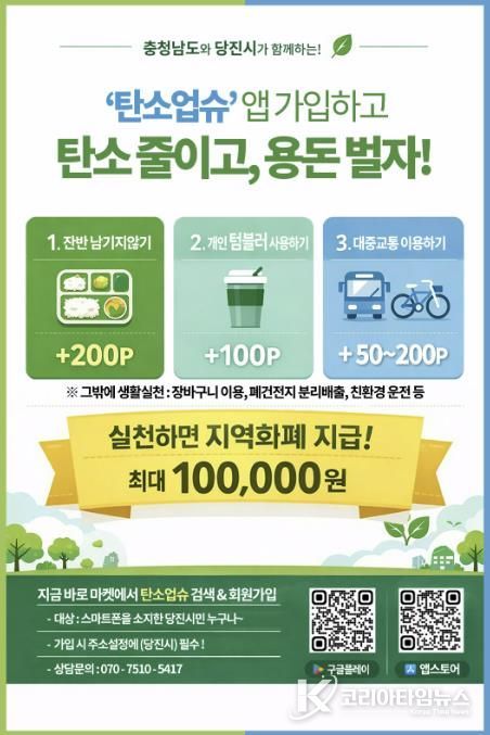 코리아타임뉴스 김택호 기자 | 당진시는 기후위기 대응을 강화하고 시민들의 자발적인 탄소중립 실천을 확산하기 위해 충남형 탄소중립포인트제 ‘탄소업슈’ 가입자 확대를 본격 추진한다고 19일 밝혔다.