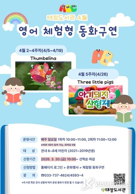 4월에는 ▲엄지공주(Thumbelina) ▲아기 돼지 삼형제(Three little pigs) 등 아이들에게 친숙하고 사랑받는 동화를 준비했다. 매주 일요일 오전 10시와 11시 2회차로 운영되며, 비용은 무료다.