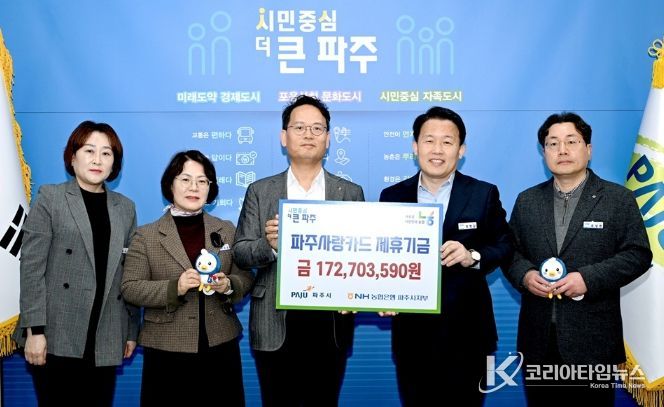 코리아타임뉴스 윤광희 기자 | 파주시는 지난 18일 엔에이치(NH)농협은행 파주시지부로부터 지난해 적립된 제휴카드 적립기금 172,703,590원을 전달받았다.