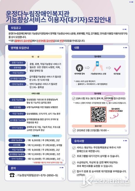 코리아타임뉴스 윤광희 기자 | 파주시 운정다누림장애인복지관은 지역 내 장애인의 기능 향상과 일상생활 능력 증진을 위해 ‘기능향상서비스’참여자를 오는 23일부터 상시 모집한다.