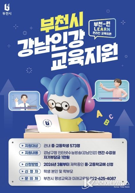코리아타임뉴스 경기취재본부 | 부천시는 2026년 ‘부천-런(Learn) 온라인 교육지원’ 사업을 추진한다고 19일 밝혔다. 이는 지난해에 이어 시행되는 것으로, 관내 중·고등학생들에게 온라인 교육 기회를 제공하고 가정의 사교육비 부담을 완화하는 데 중점을 둔다.