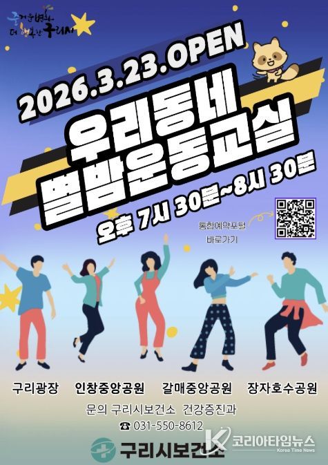 코리아타임뉴스 경기취재본부 | 구리시는 3월 23일부터 10월 30일까지 지역 주민의 건강증진과 규칙적인 신체활동 실천을 돕기 위해 구리광장, 인창중앙공원, 갈매중앙공원, 장자호수공원 등 4개소에서 ‘우리동네 별밤운동교실’을 운영한다고 밝혔다.