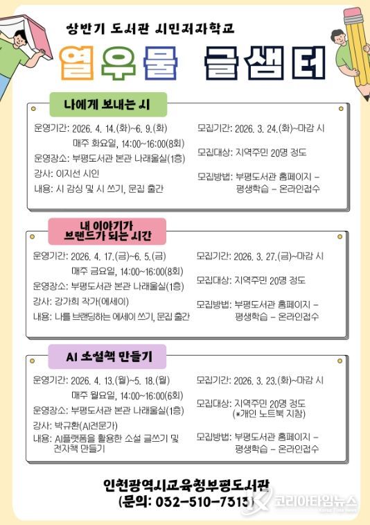 코리아타임뉴스 사회팀 | 인천광역시교육청부평도서관은 시민에게 다채로운 글쓰기 경험을 제공하고 예비 작가로서의 성장을 지원하기 위해, 상반기 시민 저자 학교 ‘열우물 글샘터’를 운영한다.