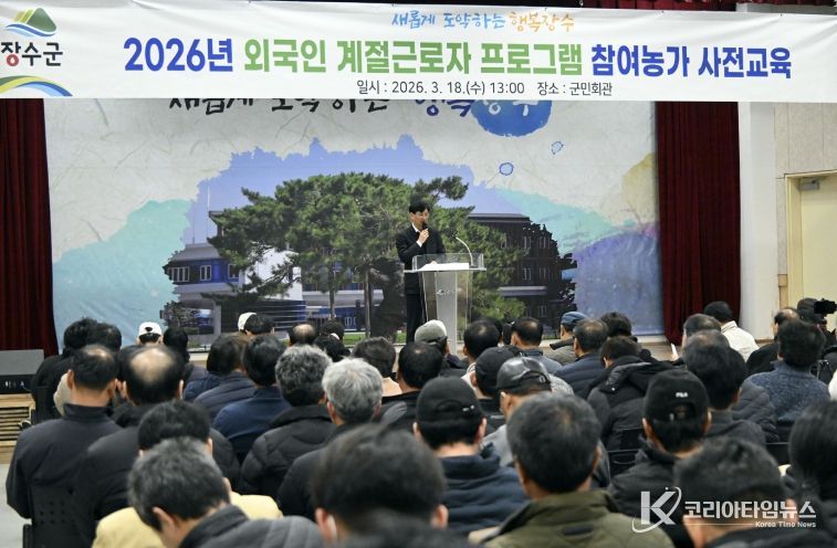 코리아타임뉴스 김태훈 기자 | 장수군은 18일 군청 군민회관에서 2026년도 외국인 계절근로자 고용농가 190명을 대상으로 사전교육을 실시했다.