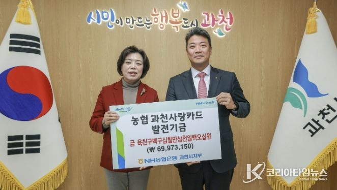 코리아타임뉴스 사회팀 | 과천시는 19일 NH농협은행 과천시지부로부터 제휴카드 사용으로 적립된 기금 6천 9백여만 원을 전달받았다고 밝혔다.