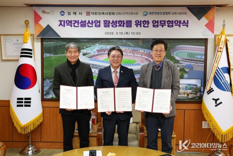 코리아타임뉴스 경남취재본부 | 김해시는 지역건설산업 활성화와 지역경제 발전을 위해 19일 오전 10시 시장실에서 대한건축사협회 김해시지역건축사회, 대한전문건설협회 김해시협의회와 ‘지역건설산업 활성화를 위한 3자 업무협약’을 체결했다.