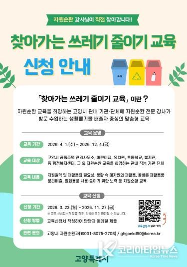 코리아타임뉴스 기동취재팀 | 고양특례시는 생활 속 자원순환 실천을 유도하기 위해 오는 4월부터 12월까지 9개월간 ‘2026년 찾아가는 쓰레기 줄이기 교육’을 운영한다.