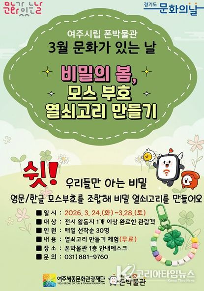 코리아타임뉴스 문화팀 | 여주세종문화관광재단이 운영하는 여주시립 폰박물관은 3월 '문화가 있는 날'을 맞아 오는 24일부터 28일까지 5일간 시민 참여형 행사 ‘비밀의 봄, 모스부호 열쇠고리 만들기’를 운영한다.