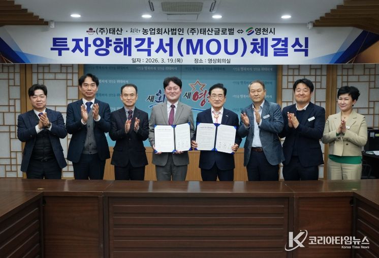 코리아타임뉴스 노승선 기자 | 영천시는 19일 시청 영상회의실에서 ㈜태산과 농업회사법인 ㈜태산글로벌과 220억원 규모의 투자협약(MOU)을 체결했다.