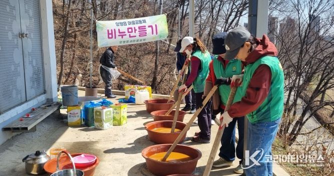 코리아타임뉴스 기동취재팀 | 양평군 양평읍새마을회는 19일 양평읍 갈산공원 내 새마을회 사무실에서 회원 20여 명이 참여한 가운데 친환경 비누 만들기 봉사활동을 진행했다.