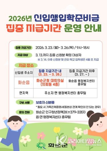 코리아타임뉴스 노승선 기자 | 화순군은 2026학년도 초‧중‧고등학교 신입생 가정의 교육비 부담을 덜고 보편적 교육복지를 실현하기 위해 입학준비금을 3월 23일부터 지급한다고 밝혔다.