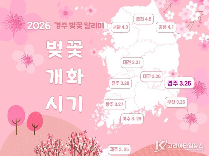 코리아타임뉴스 노승선 기자 | 경주시는 2026년 봄을 맞아 문화관광 누리집을 통해 주요 벚꽃 명소의 개화 현황을 실시간으로 제공하는 ‘벚꽃알리미’ 서비스를 운영한다고 22일 밝혔다.