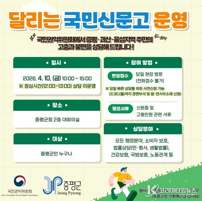코리아타임뉴스 박찬식 기자 | 충북 증평군이 오는 4월 10일 오전 10시부터 오후 3시까지 군청 대회의실에서 국민권익위원회와 함께 ‘달리는 국민신문고’를 운영한다.