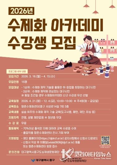 코리아타임뉴스 대구취재본부 | 대구 중구는 오는 4월 15일까지 수제화 산업 전문 인력 양성을 위한 ‘2026년 수제화 아카데미’ 수강생을 모집한다.