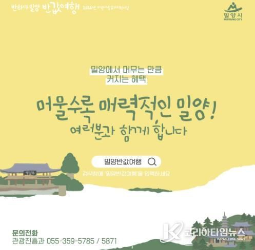 코리아타임뉴스 경남취재본부 | 경남 밀양시는 관광객의 여행 부담을 덜고 지역 상권에 활력을 더하기 위해 2026년 지역사랑 휴가지원사업인 ‘반하다밀양 반값여행’을 추진한다.