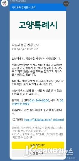 코리아타임뉴스 기동취재팀 | 고양특례시 덕양구는 23일 오늘 지방세 환급금을 수령하지 않은 납세자를 대상으로 카카오 알림톡(채널명: 덕양구지방세환급)을 발송해 환급금 조회 및 신청 방법을 안내할 예정이다.