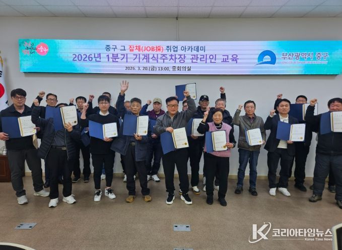 코리아타임뉴스 오영주 기자 | 부산 중구는 지난 20일 ‘2026년 중구 그 잡채(JOB採) 취업아카데미 기계식주차장 관리인 교육’ 1분기(신규) 교육 과정에서 19명의 수료생을 배출했다.