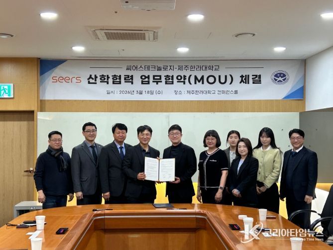 코리아타임뉴스 노승선 기자 | 제주한라대학교(총장 김성훈)는 3월 18일 ㈜씨어스테크놀로지와 AI 기반 디지털 헬스케어 인재양성을 위한 업무협약(MOU)을 체결했다고 밝혔다.
