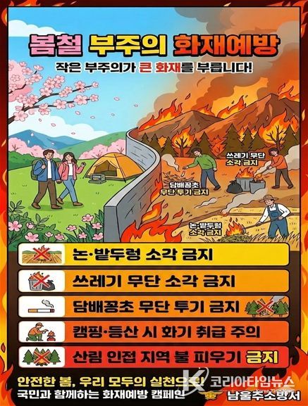 주요 화재 예방 수칙으로는 ▲논·밭두렁 소각 금지 ▲쓰레기 무단 소각 금지 ▲담배꽁초 무단 투기 금지 ▲캠핑·등산 시 화기 취급 주의 ▲산림 인접 지역 불 피우기 금지 등이다.