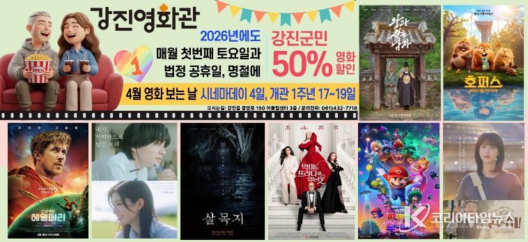 코리아타임뉴스 전남취재본부 | 강진영화관이 군민이 더 쉽게 영화를 즐길 수 있도록 운영하는 ‘영화 보는 날’ 행사로 큰 호응을 얻고 있다. 지난해 4월 17일 문을 연 강진영화관은 개관 1주년을 앞둔 올해 3월 22일 기준 누적 관람객 3만 명을 넘어서며 군민들의 꾸준한 관심 속에 지역 문화공간으로 자리잡고 있다.