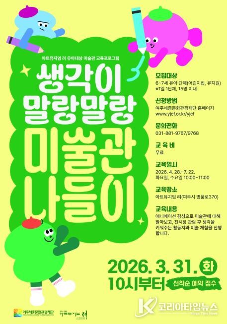 코리아타임뉴스 문화팀 | 여주세종문화관광재단은 유아를 대상으로 하는 미술관 교육프로그램 '생각이 말랑말랑, 미술관 나들이'를 오는 4월부터 10월까지 아트뮤지엄 려에서 운영한다고 밝혔다.