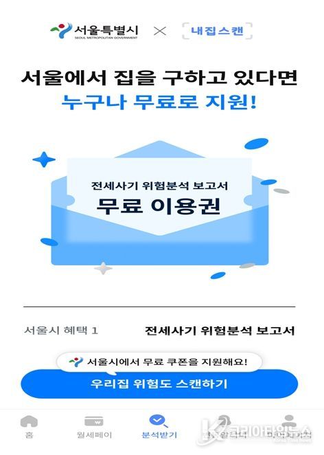 서울 지역에서 임대차계약을 예정한 만 39세 이하 청년은 서울주거포털, 청년몽땅정보통의 전세사기 위험분석 보고서 배너를 통해 ‘내집스캔’에 접속한 뒤, 서울시 무료 쿠폰을 적용해 이용할 수 있다. 25일부터 1인 최대 2회까지 무료로 지원된다.