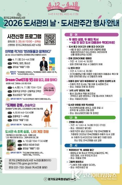 코리아타임뉴스 사회팀 | 경기도교육청성남도서관이 2026년 도서관의 날(4월 12일)과 도서관 주간(4월 12일~18일)을 맞아 다양한 독서·문화행사를 운영한다.