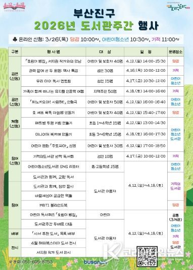 부산진구 관계자는 “구민들이 도서관주간 행사를 통해 즐겁게 도서관에 방문하고 일상 속 독서를 실천하는 계기가 되기를 바란다.”라고 전했다.