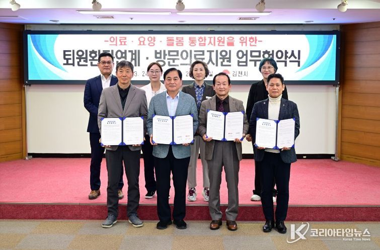 코리아타임뉴스 의료보건팀 | 김천시는 3월 24일 김천시청 2층 회의실에서 지역의료기관과 ‘퇴원환자 지역사회 연계 및 방문의료지원 사업’ 업무협약을 체결했다.