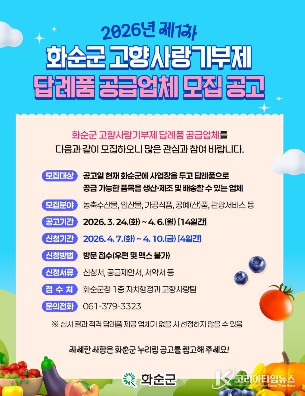코리아타임뉴스 노승선 기자 | 화순군은 24일 고향사랑기부제 활성화와 기부자 만족도 제고를 위해 2026년 제1차 고향사랑기부제 답례품 및 공급업체를 모집한다고 밝혔다.