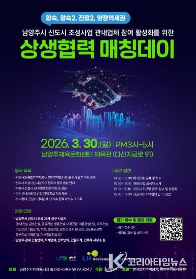 코리아타임뉴스 경기취재본부 | 남양주시는 오는 30일 남양주체육문화센터 실내체육관에서 관내 건설 관련 업체의 신도시 사업 참여율을 높이기 위해 ‘신도시 지역동행협의체 상생협력 매칭데이’를 개최한다고 24일 밝혔다.