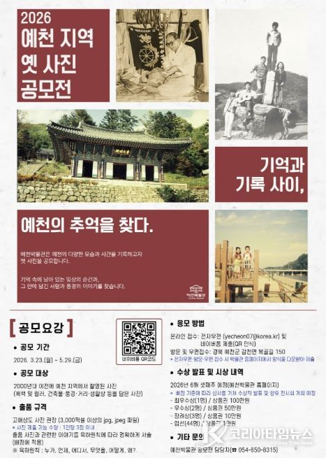 코리아타임뉴스 경북취재본부 | 예천박물관은 지역의 역사와 생활상을 담은 기록을 수집·공유하기 위한 ‘2026 예천 지역 옛 사진 공모전 – 기억과 기록 사이, 예천의 추억을 찾다’ 공모전을 5월 29일까지 개최한다.