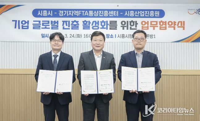 코리아타임뉴스 경기취재본부 | 시흥시는 지난 3월 24일 시청 혁신토론방에서 경기지역FTA통상진흥센터, 시흥산업진흥원과 관내 중소기업의 수출 확대와 글로벌 진출 지원을 위한 업무협약을 맺었다.