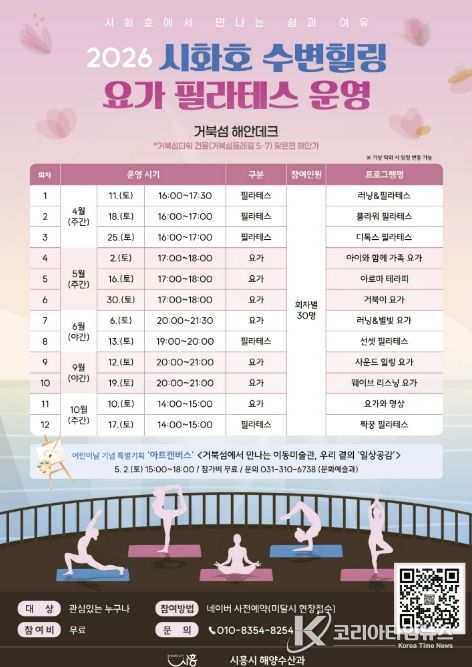 코리아타임뉴스 경기취재본부 | 시흥시는 시화호 수변의 자연경관을 활용해 시민들에게 일상의 여유와 휴식을 제공하는 ‘시화호 수변 힐링 프로그램’을 오는 4월 11일부터 10월 17일까지 운영한다.
