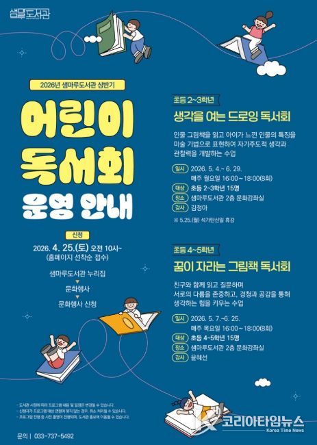 코리아타임뉴스 이아름 기자 | 원주시 샘마루도서관은 오는 5월부터 6월까지 관내 어린이를 대상으로 ‘상반기 어린이 독서회’을 운영한다.