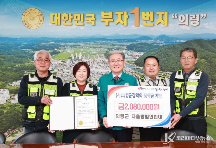 코리아타임뉴스 경남취재본부 | 의령군은 지난 23일 의령군 자율방범연합대(회장 강철석)가 지역 인재 양성을 위해 (사)의령군장학회에 장학금 208만원을 기탁했다고 밝혔다.