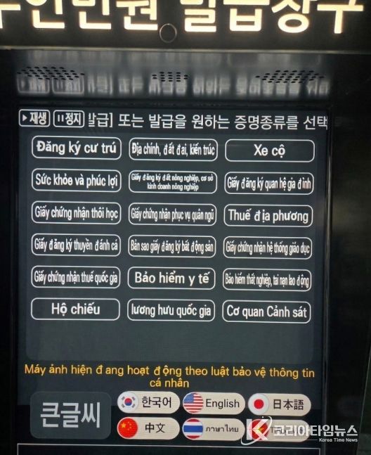코리아타임뉴스 노승선 기자 | 서울 중구는 한국어가 서툰 다문화 가족과 귀화 주민을 위해 무인민원발급기에 ‘외국어 지원 서비스’를 도입하고 시범 운영에 들어갔다. 시범 운영 장소는 외국인 방문이 잦은 중구청사와 다문화 거주 비율이 높은 광희동 주민센터 두 곳이다.