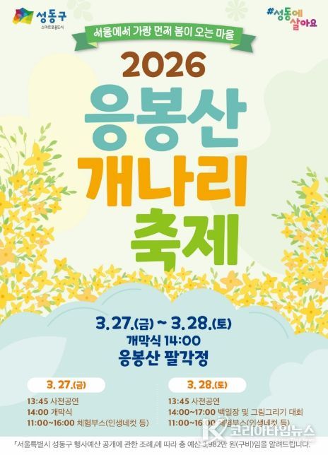 코리아타임뉴스 박찬식 기자 | 서울 성동구는 오는 3월 27일부터 28일까지 이틀간 봄의 기운을 가득 품은 응봉산에서 ‘2026년 응봉산 개나리 축제’를 개최한다.