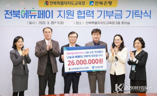 코리아타임뉴스 사회팀 | 전북에듀페이카드 운영사인 전북은행이 전북특별자치도교육청에 장학금 2,600만 원을 기부했다.