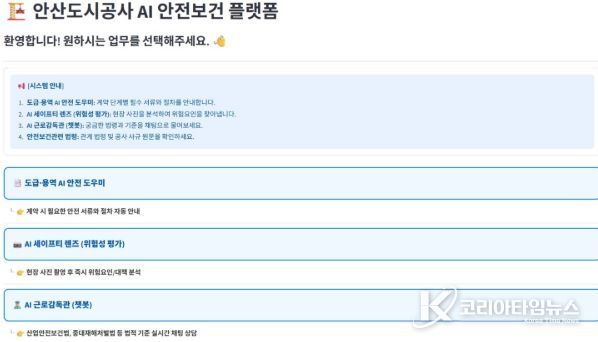 코리아타임뉴스 윤광희 기자 | 안산도시공사는 생성형 인공지능(AI) 기술을 접목한 ‘AI 안전보건 플랫폼’을 자체 개발해 현장 사고 예방 업무에 본격적으로 활용한다고 25일 밝혔다.