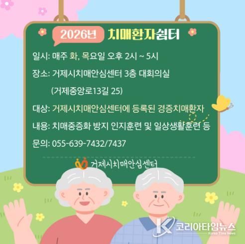 한편 거제시치매안심센터 쉼터 프로그램은 경증치매환자를 대상으로 연중 운영되고 있으며, 이용 관련 문의는 유선으로 전화하면 된다.