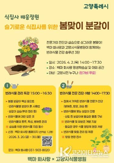 코리아타임뉴스 기동취재팀 | 고양특례시는 시민의 정서·마음 치유를 위한 ‘식집사 배움정원, 반려식물 돌보기 과정’을 오는 4월 2일부터 운영한다.